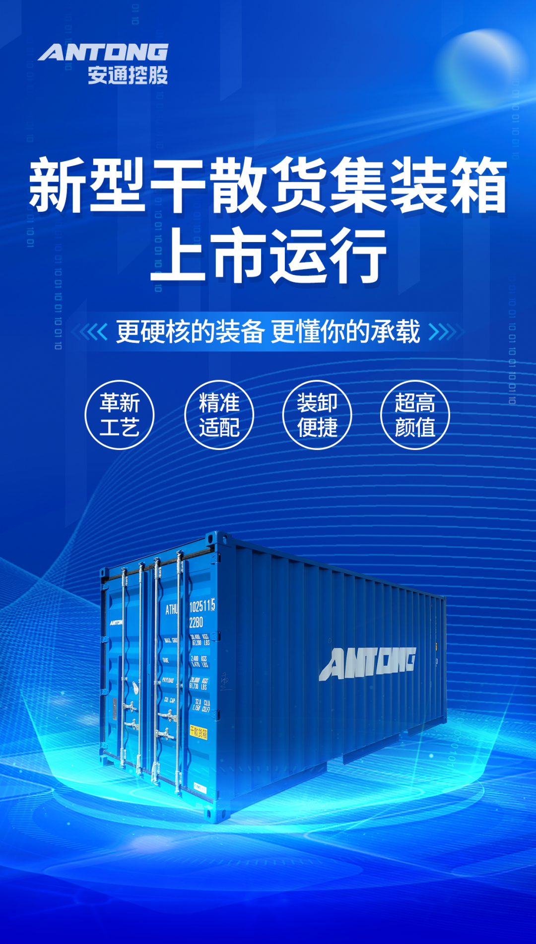 安通控股2023年新造箱融入全新品牌形象,植入企业独有精神内核。箱体为安通主色调——远洋蓝,更加稳重、更具高级感,漆涂白色纯英文logo,彰显着安通守正创新、融合俱进的包容心态与开阔视野。